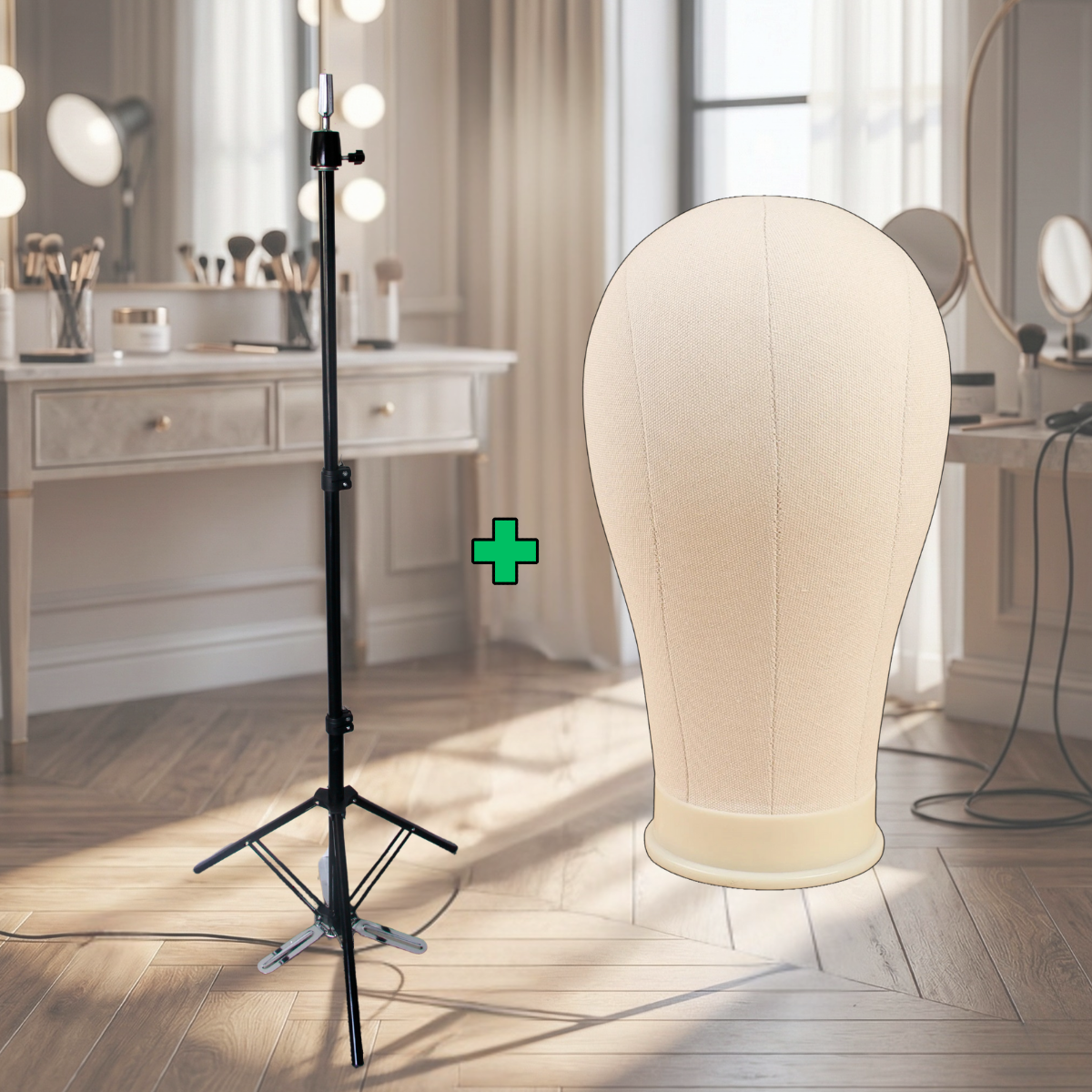Ele tem uma altura de 30 cm, com a cabeça medindo 56 cm de diâmetro, e a base inferior do suporte tem um diâmetro de 11 cm. Além disso, é de cor branca, feito de pano e pode ser usado em todos os modelos de lace e perucas.