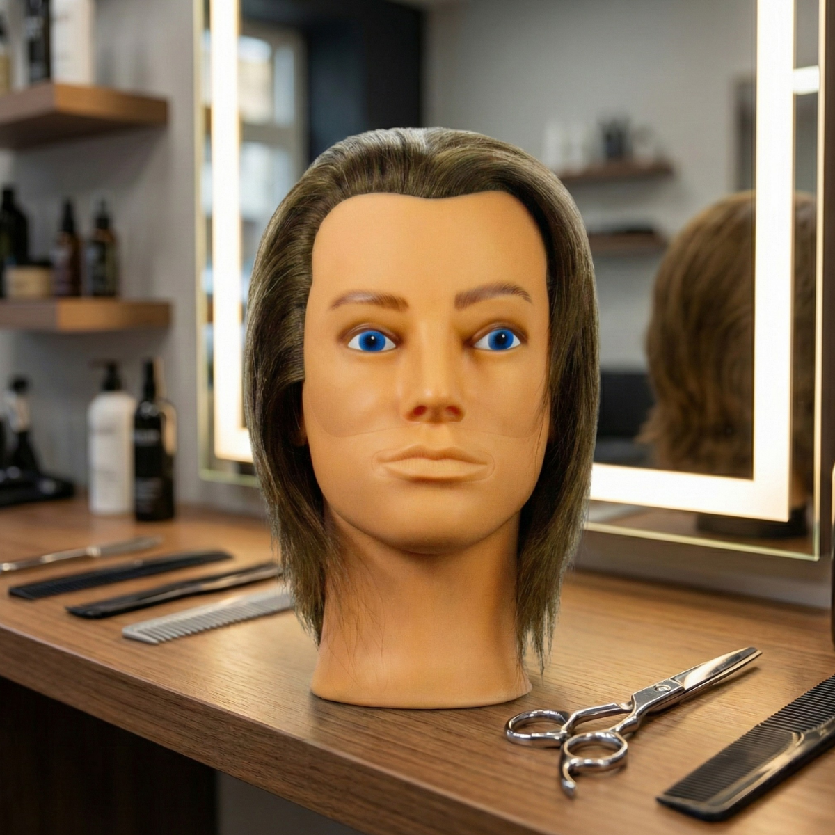 O manequim masculino sem barba e sem suporte é uma ferramenta projetada para cabeleireiros iniciantes que desejam praticar suas habilidades. Fabricado com fios de cabelo 100% humano e material resistente de borracha, suporta fontes de calor até 250ºC, como secador, prancha e modelador de cachos. Com características como cabelos lisos de fácil manuseio, com comprimento de 30 cm, manequim na cor branca, é ideal para treinos de aperfeiçoamento em cortes. Ideal para escolas de beleza ou qualquer ambiente relacionado à área.